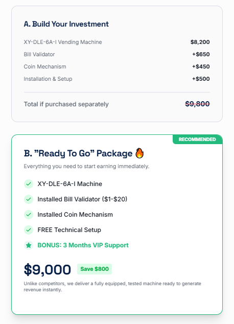 Stop trading time for money. Start with a refrigerated vending machine that generates revenue while you sleep, work, or travel.